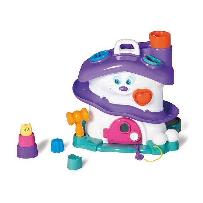 O brinquedo ainda vem com um martelinho impulsiona a bolinha e afina a coordenação motora do bebê.