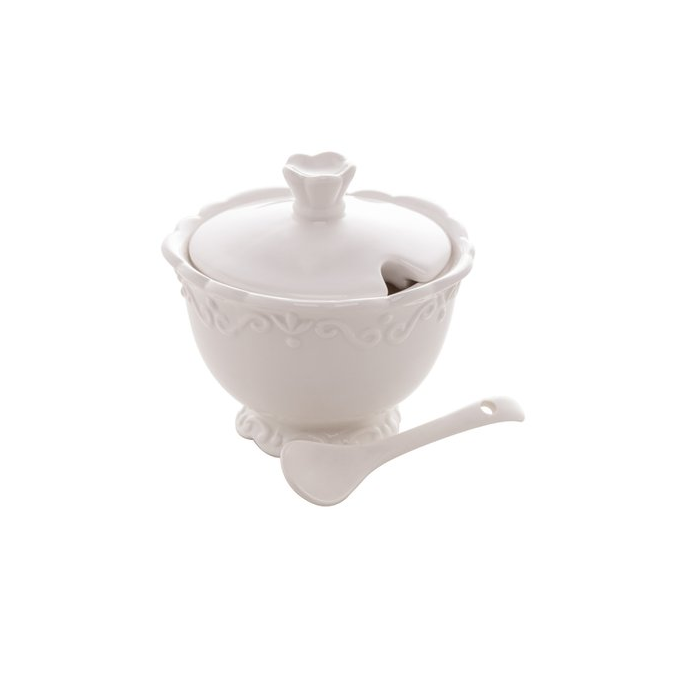 Açucareiro Porcelana Com Tampa E Colher Alto Relevo Branco 10,5x9,5 -