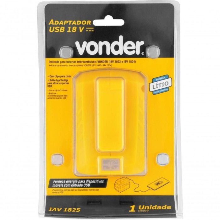 Adaptador Usb 18v S/ Bateria E S/ Carregador Iav 1825 Vonder Marca: Vonder Conteúdo da embalagem: 1 Adaptador. Destaques e diferenciais:Possui clipe para cinto e botão Liga/Desliga para ativar as portas USB. Dicas de uso:Indicado para fornecer energia para qualquer dispositivo móvel com entrada USB, como por exemplo: smartphones, tabletes, câmeras digitais, entre outros. Utilizado com a bateria 18 V da linha intercambiável Vonder. É possível transformar a bateria VONDER em uma fonte de energia portátil (Power Bank). Não acompanha bateria e carregador. Baterias indicadas: Bateria 18 V 2.0 Ah IBV 1802 VONDER (60.04.180.200) e Bateria 18 V 4.0 Ah IBV 1804 VONDER (60.04.180.400). Detalhes Técnicos:Tensão/corrente de saída: 5 V - 2 ATipo de saída: 2 saídas USB tipo ACapacidade da bateria indicada: 2 Ah / 4 AhBateria indicada: 18 V - Íons de lítioDimensões: 97 mm x 66 mm x 37 mm NA