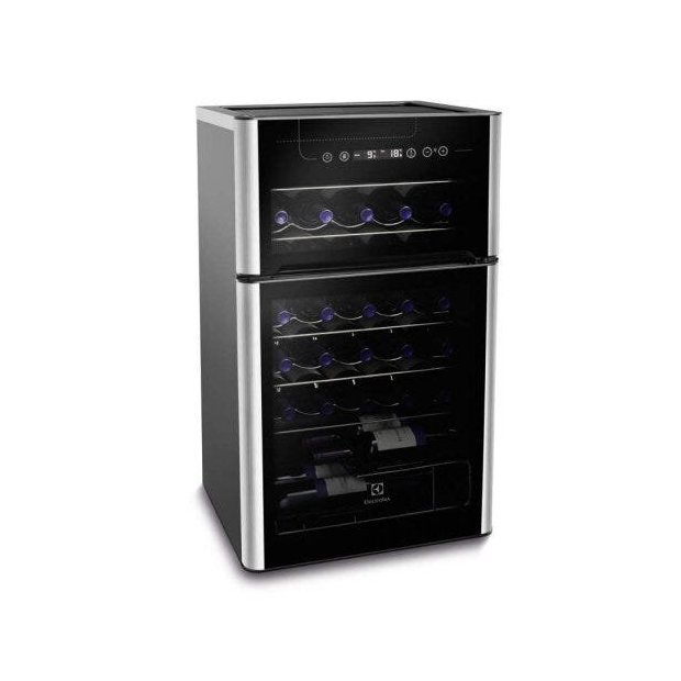 Adega com novo design, com tampo em vidro temperado que serve de suporte para taças e garrafas. Dual zone, a temperatura ideal para os seus diferentes vinhos. Com 2 zonas de refrigeração separadas, ele permite que diferentes tipos de vinho sejam armazenados na temperatura certa. Painel de controle moderno e completo para a sua adega. A primeira adega no brasil com painel eletrônico touch control. Com o display de temperatura externo, permite controlar a temperatura sem ter que abrir a adega desnecessariamente, além de ser muito mais moderno e bonito. Saiba a temperatura ideal para o seu vinho com mais facilidade, led indicador do tipo vinho, que indica qual o tipo de vinho ideal para a temperatura selecionada. Adega com acabamento em aço inox que traz maior durabilidade e sofisticação.