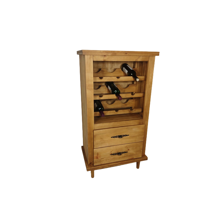 Adega de Madeira Rústica com 2 Gavetas e Pés Palito Cera Clara - Adega de Madeira de Pinus com Pés Palito