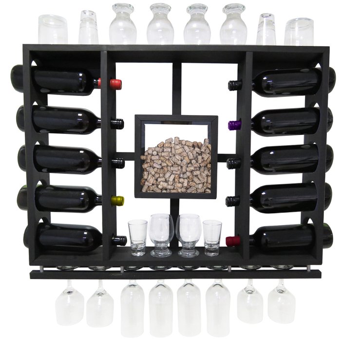 - Capacidade na parte inferior do porta rolhas: 3 copos/taças ou 8 copos de shot