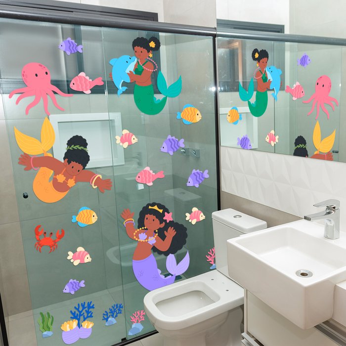 Adesivo Box de Banheiro Infantil Sereias Reunião no Mar Arte na Arte Adesivo Fundo do Mar Sereia
