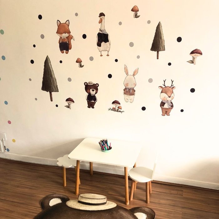 - A cartela vem com coelho, raposa, urso, ganso, alce, 2 árvores, cogumelos e bolinhas para espalhar pela parede