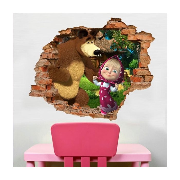 Adesivo de Parede Buraco Falso 3D Masha e o Urso - P 45x55cm