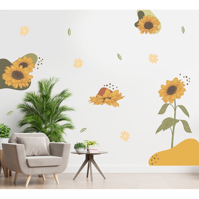 O Adesivo de Parede Girassol decora ambientes como salas, quartos, home offices,... Eles parece uma pintura e tem formas orgânicas e florais que trazem leveza para o ambiente