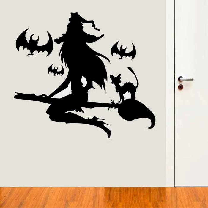 Adesivo de Parede Halloween Bruxa na Vassoura Voando-Grande 100x98cm