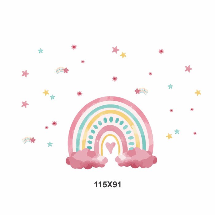 - O tamanho P é composto por um arco íris de 55x45cm e vários elementos para espalhar pela parede
