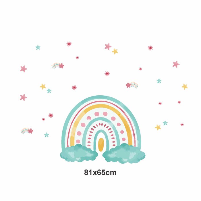 - O tamanho M é composto por um arco íris de 81x65cm e vários elementos para espalhar pela parede