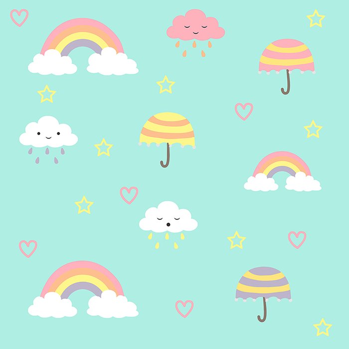- A cartela é composta por 3 arco íris, 3 nuvens com gotas, 3 arco íris e corações e estrelas para completar a parede