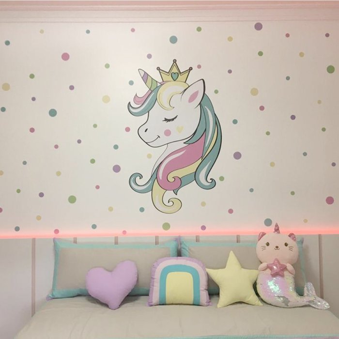 - Adesivo de Parede com um unicórnio e várias bolinhas coloridas para espalhar pela parede