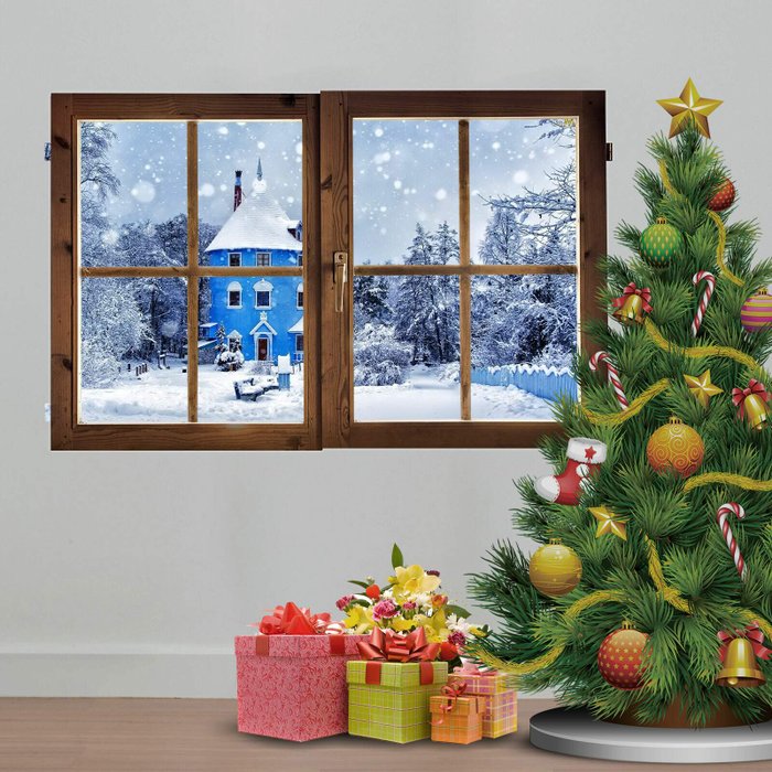 Adesivo de Parede Janela Falsa Natal Neve 01-Grande 130x80cm