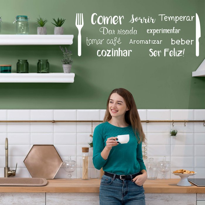 Adesivo de Parede Palavras Cozinha Comer Dar Risada Garfo Faca Horizontal Kanto Store Branco