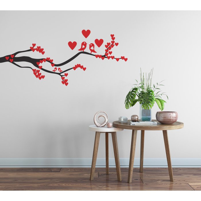 Adesivo Decorativo Passarinho Árvore Galho Carregado de Amor preta com corações em vermelho