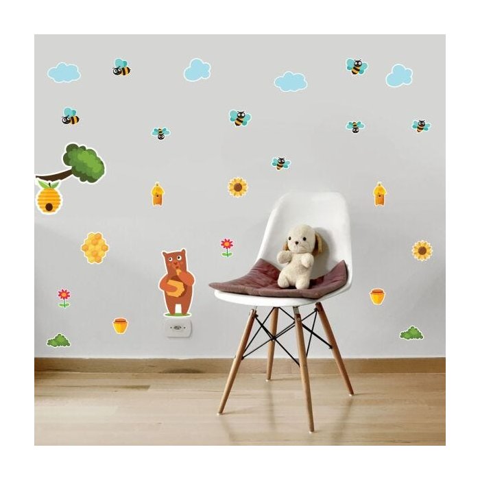 Papel de parede adesivo destacável no formato de objetos de abelhas, ursos, flores. Produto autoadesivo, dispensa o uso de cola. Adesivo de alta qualidade com acabamento fosco liso, não apresenta relevo ou textura. A cartela contém 35 unidades com tamanhos e objetos variados. Os destacáveis contém uma borda de 2 milímetros na cor branca. Importante Confira as medidas do local e calcule quantas cartelas são necessárias antes de efetuar a compra, pois podem ocorrer variações de cores entre lotes. Você pode colar em superfícies lisas como: Paredes de massa corrida, gesso, tinta acetinada, látex e acrílica. Azulejos, divisórias, fórmicas, MDF, portas, vidros, espelhos, móveis e eletrodomésticos. Limpeza e Conservação Antes de colar: Limpe o local com pano seco para retirar poeira e impurezas. Depois de colado: Pano macio umedecido em água e detergente neutro (não utilize abrasivos ou produtos com solvente). Obs: O tom da cor do material pode variar da cor vista na tela devido a configuração de cores do seu monitor. Veja o tamanho do desenho Veja como é fácil colar