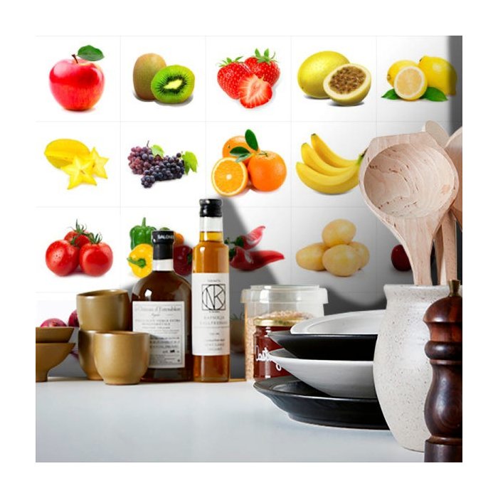 Adesivo Destacável que imita azulejos com tema de frutas e verduras. Produto autoadesivo, dispensa o uso de cola. Disponível em cartelas com adesivos destacáveis que são mais utilizados para azulejos com rejunte largo (rejunte maior que meio centímetro) conforme abaixo. Adesivo de alta qualidade com acabamento fosco liso, não apresenta relevo ou textura. Tamanhos disponíveis. - 10x10cm = 90 unidades - 15x15cm = 36 unidades - 20x20cm = 18 unidades. Importante: Confira as medidas do local e calcule quantas unidades destacáveis serão necessárias antes de efetuar a compra, pois podem ocorrer variações de cores entre os lotes. Você pode colar em superfícies lisas como: Paredes de massa corrida, gesso, tinta acetinada, látex e acrílica. Azulejos, divisórias, fórmicas, MDF, portas, vidros, espelhos, móveis e eletrodomésticos. Limpeza e Conservação. Antes de colar: Limpe o local com pano seco para retirar poeira e impurezas. Depois de colado: Pano macio umedecido em água e detergente neutro (não utilize abrasivos ou produtos com solvente). Obs: O tom da cor do material pode variar da cor vista na tela devido a configuração de cores do seu monitor. Veja como é fácil colar