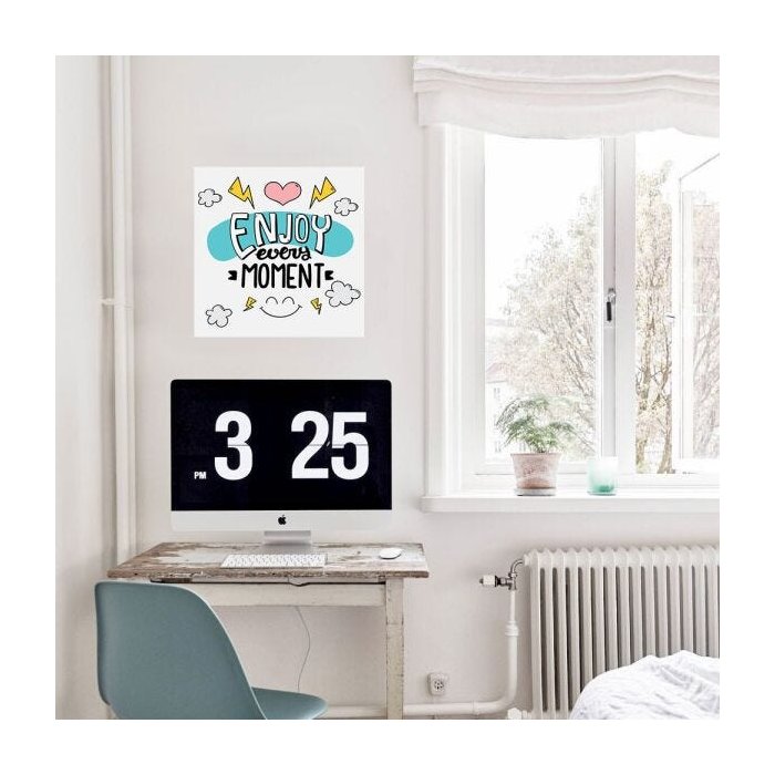Adesivo Frase Moments. Inspire-se, anime-se, decore e torne seu ambiente mais leve e descontraído com nossos adesivos de parede com Frases para alegrar o seu dia Produto autoadesivo, dispensa o uso de cola. Adesivo de alta qualidade com acabamento fosco liso, não apresenta relevo ou textura, não possui moldura. Disponível na medida: 0,50m de largura x 0,50m de comprimento. Você pode colar em superfícies lisas como: Paredes de massa corrida, gesso, tinta acetinada, látex e acrílica. Limpeza e Conservação: Antes de colar: Limpe o local com pano seco para retirar poeira e impurezas. Depois de colado: Pano macio umedecido em água e detergente neutro (não utilize abrasivos ou produtos com solvente). Obs: O tom da cor do material pode variar da cor vista na tela devido a configuração de cores do seu monitor. Veja o tamanho do desenho Veja como é fácil colar