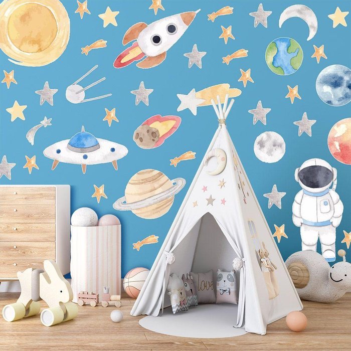 Adesivo Parede Infantil Astronauta Aquarela Planetas Naves