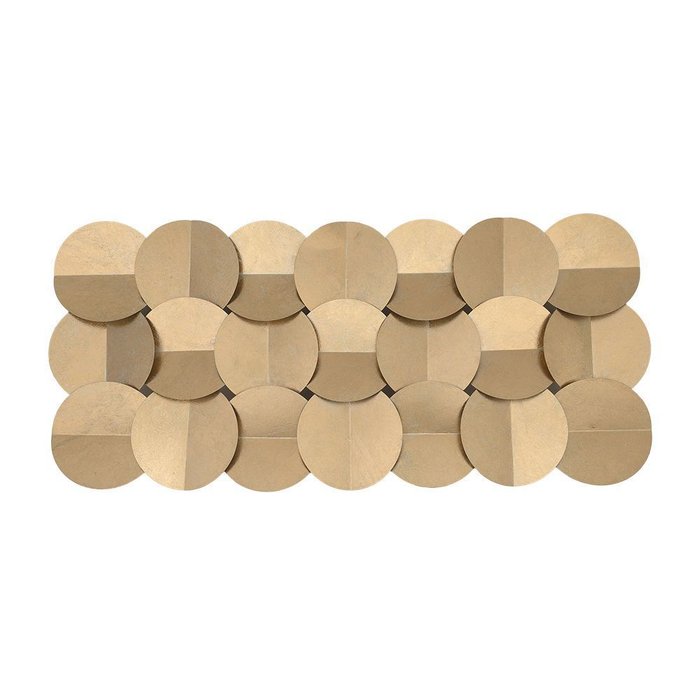 Com dimensões generosas de 46 cm de altura (A), 101 cm de largura (L) e 3 cm de profundidade (P), este adorno é ideal para preencher grandes superfícies com elegância. Cada disco metálico é dividido em nuances de tons dourados e champanhe, alternando entre acabamentos que capturam a luz de formas diferentes, conferindo uma aura de exclusividade e modernidade à peça.