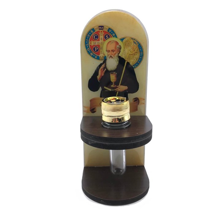 Adorno para porta ou mesa com aspersório para água benta de São Bento, produzido em MDF com cobertura de resina.