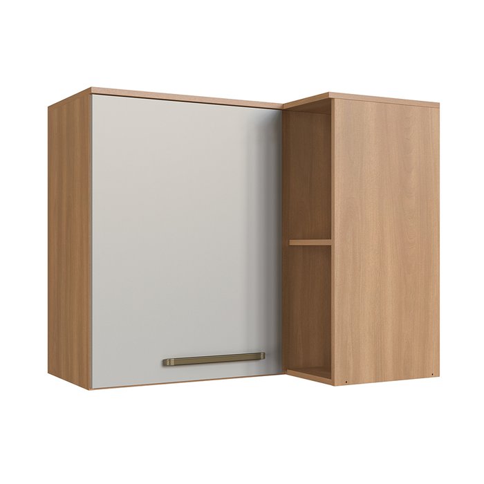 Esse modelo é composto por armários e prateleiras suspensos na parede, o que ajuda a aproveitar melhor a área disponível na cozinha.