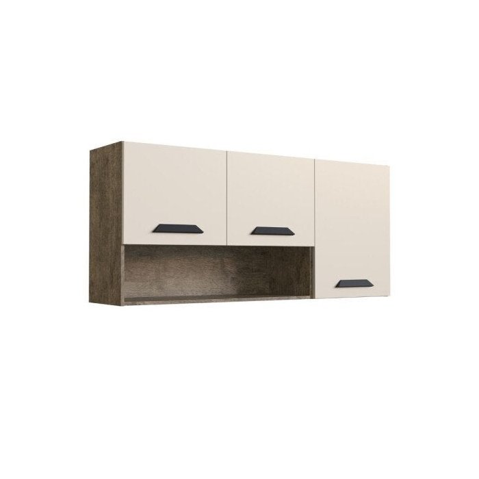Esse modelo é composto por armários e prateleiras suspensos na parede, o que ajuda a aproveitar melhor a área disponível na cozinha.