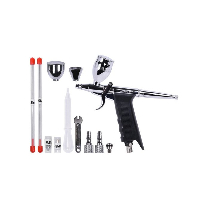 Indicado para trabalhos artesanais e retoques que exijam precisão e qualidade como: micropinturas, retoques, personalização de veículos, capacetes, tanques de motos, entre outros.Características Técnicas:- Consumo de ar do aerógrafo: 0,39 PCM (11 l/min);- Material do aerógrafo: cobre;- Pressão máxima de trabalho do aerógrafo: 15 lbf/pol² - 50 lbf/pol²;- Capacidade do copo: 2 ml, 5 ml e 13 ml;- Rosca de entrada de ar do aerógrafo: 1/8" NPT macho;- Comprimento da mangueira: 1,8 metros.Itens Inclusos:- 1 pistola (aerógrafo);- 1 Mangueira com 1,8M;- 3 copos (2ml, 5ml e 13ml);- 3 bicos (3 mm, 5 mm e 8 mm);- 3 agulhas ((3 mm, 5 mm e 8 mm);- 1 chave;- 1 adaptador (1/4'' NPT fêmea - 1/8'' macho NPT)- 2 conectores para mangueira (rosca 1/8' NPT fêmea - espigão 3/16'')- 1 tubo de sucção