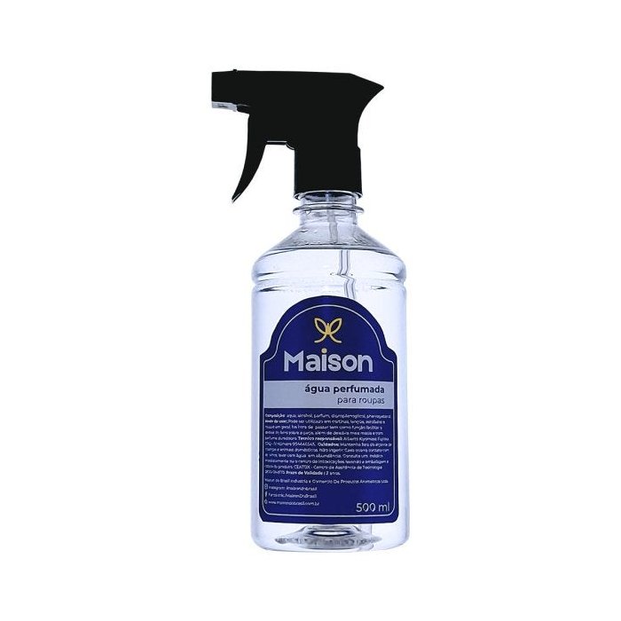 A Água Perfumada Maison, tem como função única, desodorizar tecidos, elimina ácaros, micro-organismos, fungos e bactérias e a sua composição química foi desenvolvida especialmente para aplicação em tecidos e tem como principal diferencial a sua concentração de essências delicada e suavemente perfumada.
