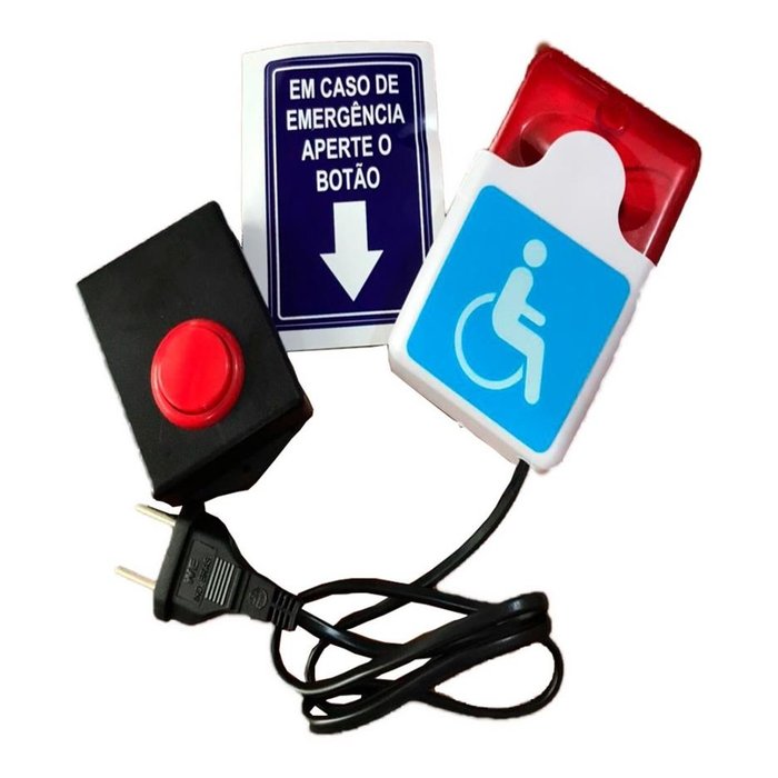 O alarme para banheiro audiovisual emite sinais sonoros e luminosos, possui alcance de aproximadamente 10 a 50 metros. O contato da botoeira e alarme é feita sem fio, a botoeira possui uma bateria de 12v. Sua botoeira deve ser instalada a 40cm (norma nbr9050) do chão permitindo assim o fácil acionamento em caso de emergência.