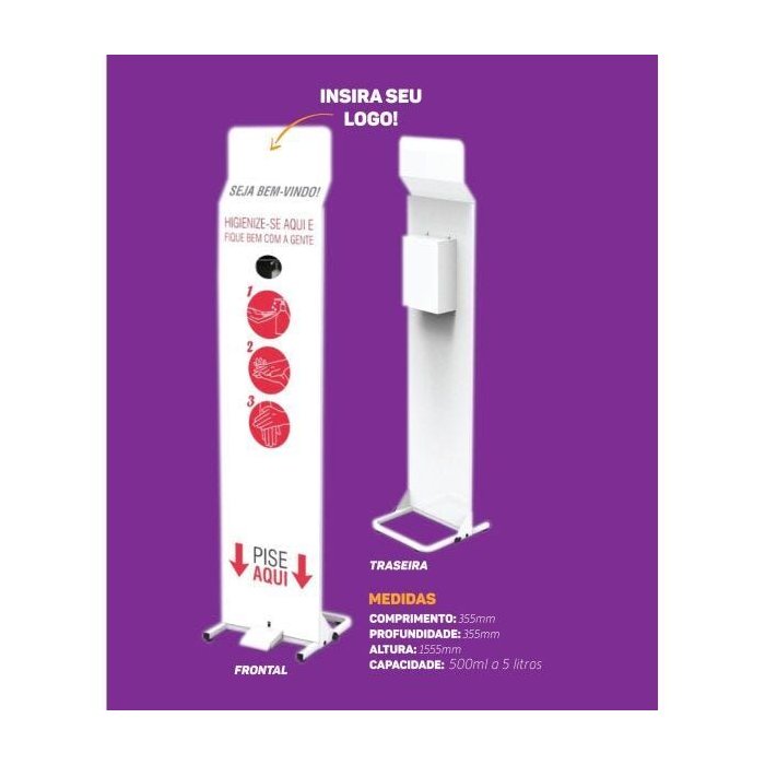 Dispenser para álcool em gel com acionamento por pedal, muito mais higiênico e seguro.Indicado para consultórios, supermercados, farmácias, escritórios, igrejas, condomínios e todas as situações ou estabelecimentos que tenham fluxo grande de pessoas.Capacidade de 500 ml até 5 litros de álcool em gel.Altura: 155,5 cmLargura: 35,5 cmProfundidade: 35,5 cmÉ possível personalizar com o logotipo do estabelecimento (personalização por conta do comprador).