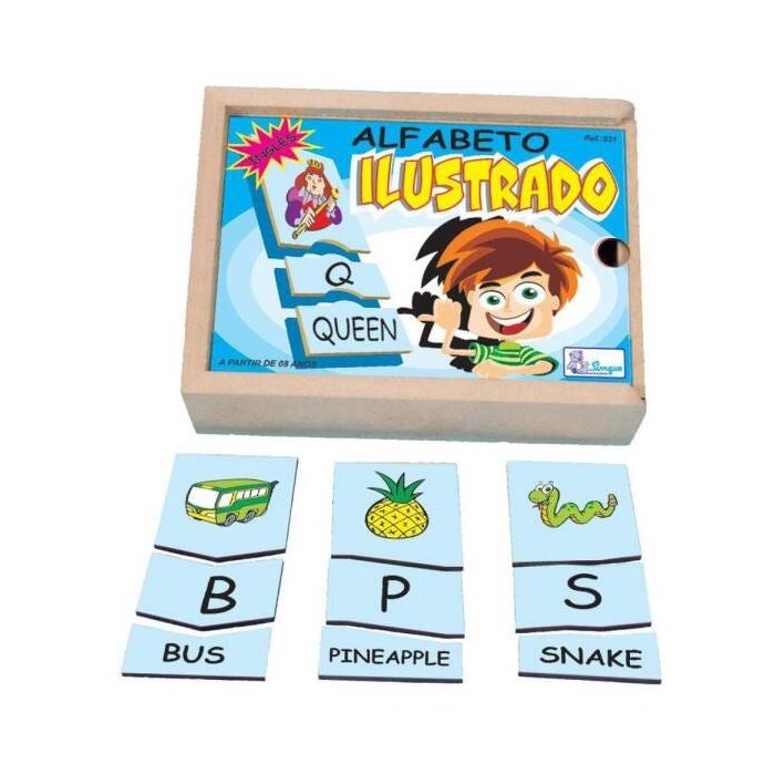 Alfabeto Ilustrado em Inglês Simque. As 26 palavras que compõem o alfabeto ilustrado fazem parte do vocabulário da criança e juntamente com o desenho, provocam a associação significativa entre imagem e palavra, auxiliando no aprendizado da linguagem inglesa. Contem 78 peças em madeira (MDF) / faixa etária de 8 anos de idade. ATENÇÃO: Não recomendável para menores de 6 anos por conter partes pequenas que podem ser engolidas. Segurança CEBRI/INNAC 0206001 NBR NM 300/2002 segurança de brinquedos.