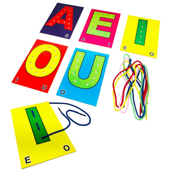 Conteúdo da Embalagem: 1 Alfabeto Móvel Alinhavo de Vogais com 5 peças e 5 Cordões.
