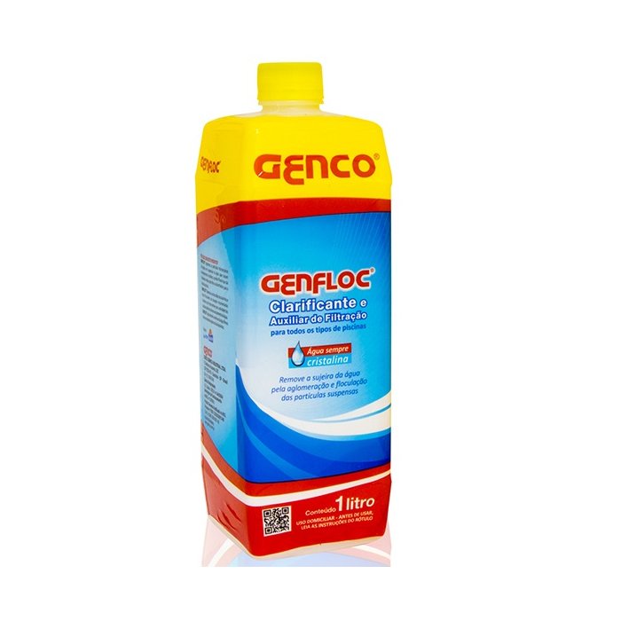 GENFLOC Clarificante e Auxiliar de Filtração GENCO® é um eficiente clarificante a auxiliar de filtração para águas de piscinas. Sua ação floculante atrai eletrostaticamente as partículas de sujeira que normalmente passariam pelo meio filtrante e forma com elas flóculos grandes que o filtro passa a reter. Isso aumenta o rendimento do filtro. Os flocos maiores e mais pesados decantam para o fundo da piscina de onde podem ser aspirados normalmente. O resultado é a clarificação completa da água.