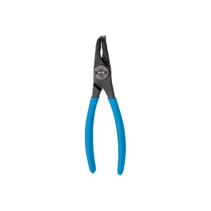 Corpo fabricado em aço Gedore-Vanadium e empunhadura plastificada na cor azul padrão Gedore. Possui acabamento escurecido. O Alicate com pontas fixas e curvas 90º é indicado para anéis de segurança internos conforme norma DIN 472 e DIN 984.