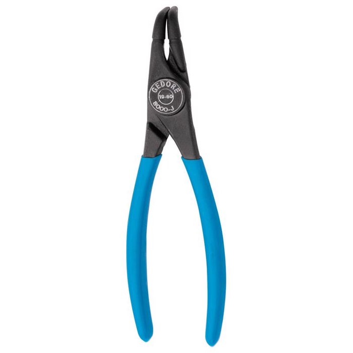 Corpo fabricado em aço Gedore-Vanadium e empunhadura plastificada na cor azul padrão Gedore. Possui acabamento escurecido. O Alicate com pontas fixas e curvas 90º é indicado para anéis de segurança internos conforme norma DIN 472 e DIN 984.