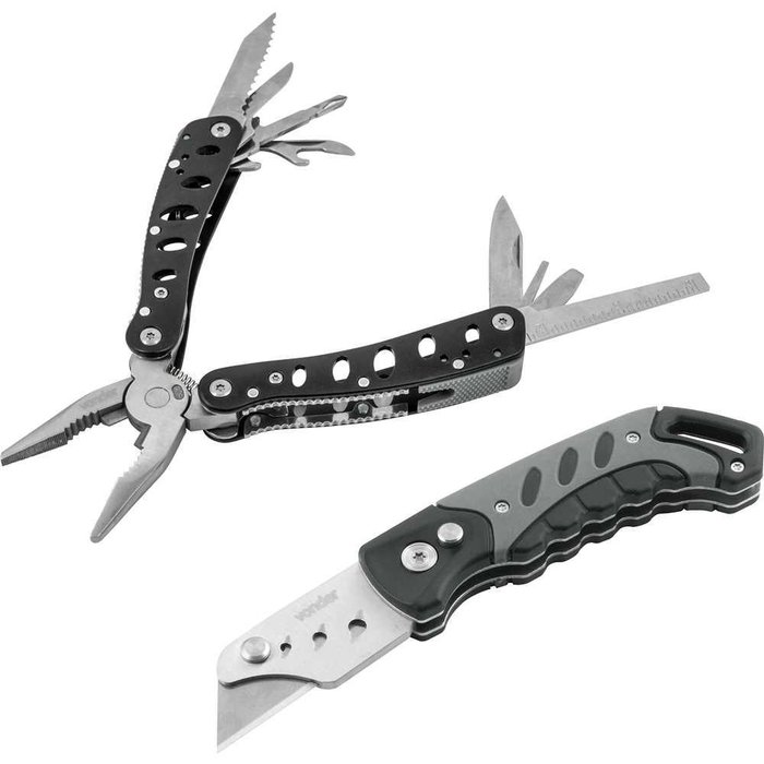 Alicate canivete e um estilete jogo com 2 peças VONDER<br>Alicate canivete com o corpo em aço inox, proporcionando maior resistência à oxidação/corrosão. Estilete com botão de travamento da lâmina, conferindo maior segurança, além de lâmina trapezoidal substituível.<br>Conteúdo:<br>1 Jogo composto por 2 peças, sendo: 1 alicate com cabo dobrável com 8 lâminas (1 faca, 1 lâmina multiuso, 1 lima, 1 serra, 1 fenda pequena, 1 fenda, 1 phillips e 1 abridor de garrafa) e 1 estilete com 1 lâmina.<br>Material do canivete/estilete: Aço carbono | Material do corpo do alicate: Aço inox | Acabamento: Polido | Comprimento total do alicate: 165 mm | Comprimento total do canivete/estilete: 175 mm | Massa aproximada (peso) (kg): 0,4 kg