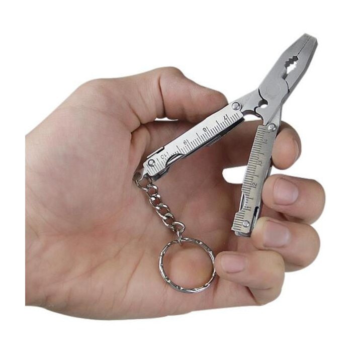 • Alicate multi ferramentas • Fabricado em aço inoxidável e polido • Inclui prático estojo portátil • Comprimento total: 90 mm • Comprimento encolhido: 50 mm • Pode ser usado como chaveiro • Ideal para qualquer situação • Possui 15 funções, sendo: - 01 Alicate bico meia cana - 01 Alicate mandíbula curva - 01 Cortador de cabo - 01 Descascador de fios - 02 Chaves de fenda: 3/16” – 5/64” - 01 Chave phillips: #0 - 01 Abridor de latas - 01 Lima de único sentido - 01 Lima de duplo sentido - 01 Lima de unhas - 01 Removedor de anzol - 01 Faca - 01 Régua em milimétrica - 01 Régua em polegadas