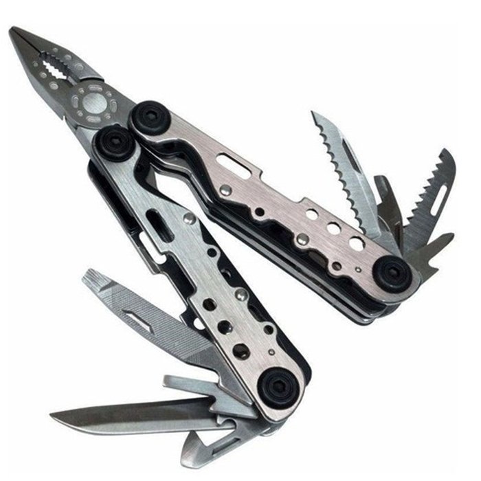 Ele é extremamente resistente e conta com 10 funções diferentes que são: Alicate com cortador de fio, lâmina limpa de dois lados, abridor de latas, chave de fenda pequena, serra dupla, serra simples, chave Phillips, abridor de garrafas, abridor de lacre.
