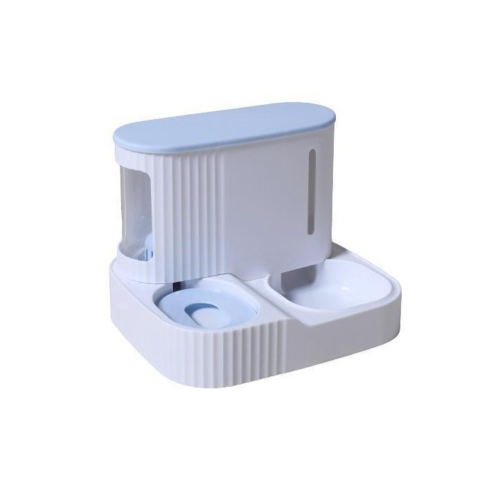O comedouro 2 em 1 possui um compartimento para ração que vai deixando a ração cair conforme o animal se alimenta e um compartimento para água com uma garrafinha que também libera conforme o pet usa.