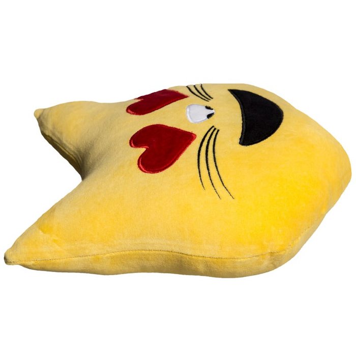 Almofada Emoji Gato Apaixonado em tecido amarelo, enchimento de fibra siliconada antialérgica com apliques bordados, alta qualidade.