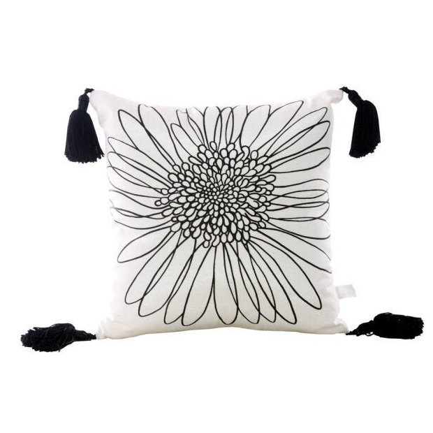 Almofada em seda mista com estampa de flor preta com pingentes de seda preto, já vem com recheio de fibra siliconada e zíper lateral para facilitar a lavagem e conservação. Almofada chique e sofisticada para diversos ambientes....