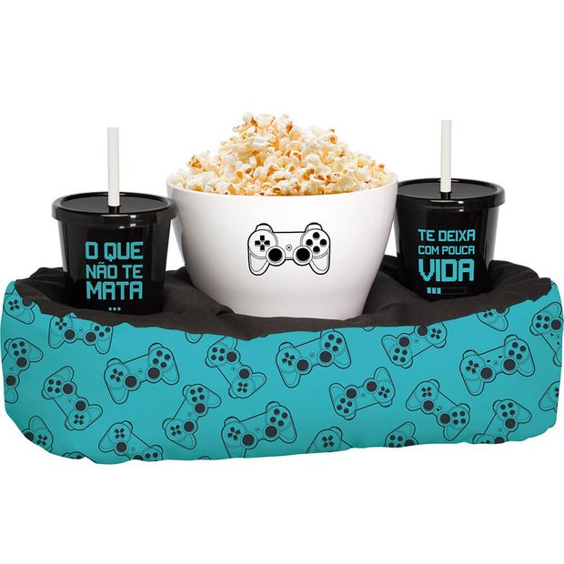 Mas tudo vai ficar ainda mais delicioso e divertido com esta linda almofada, que serve como suporte para uma pipoqueira sensacional e dois copos gamer.