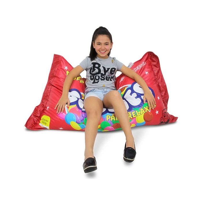 Um pufe grande em formato de almofadão com estampa de um pacote de confetes, uma excelente opção para o quarto da criançada ou até mesmo para o escritório, sala ou área de lazer, pois além de muito confortável é, também, impermeável e hipoalérgico, sendo, também, fácil de limpar.