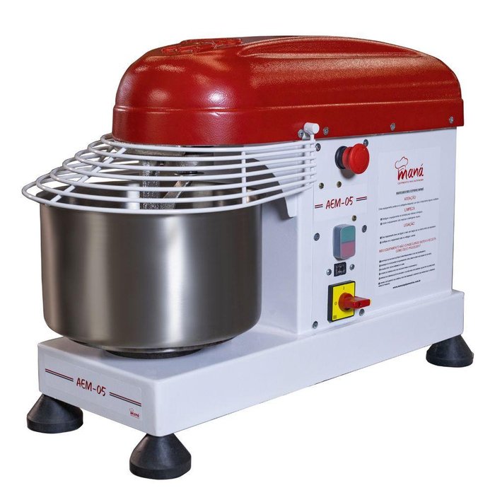 ; ;Amassadeira 5kg Espiral Industrial ManáA linha de Amassadeiras da Maná é ideal para alta produção de massas pesadas similares a pães, pizzas, pasteis, esfirras, panetone, empadão, hambúrgueres, pão de queijo e muito mais. A alta produtividade da amassadeira espiral auxilia a ampliar sua produção e aperfeiçoar ainda mais seus produtos, atingindo o ponto exato para sua receita sem esforço algum.CARACTERÍSTICAS:Tacho em aço inox;Capacidade 5 kg de massa pronta;Botão de emergência;Botão Liga/Desliga;Peças em alumínio e ferro fundido;Pés emborrachados com regulagem;Rolamentos blindados;Misturador em ferro fundido revestido com estanho;Corpo em chapa de aço SAE 1020;Acabamento com pintura eletrostática epóxi;Carenagem em polímero termo formado de alta resistência;Sistema de segurança NR-12;Produto nacional.
