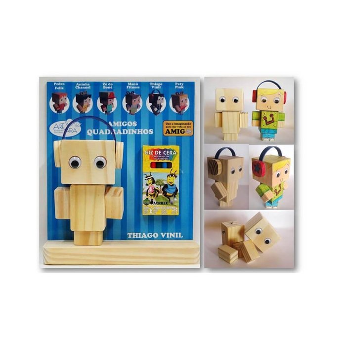 Amigos Quadradinhos Pinta Madeira Thiago Vinil - Artyara faz parte da coleção Pop! Bloc, da Artyara. É um boneco em madeira articulado, com 5 peças que se encaixam por botões de pressão em suas junções. Assim, a criança pode montar e desmontar quantas vezes quiser! Mas não é só isso: as peças são feitas em madeira crua, e podem ser pintadas de acordo com a imaginação, com os gizes de cera que acompanham o boneco, ou com guache, lápis de cor, o que a criança escolher! O Thiago Vinil vem com olhinhos que se mexem e fones de ouvido divertidos. Ótimo brinquedo para estimular a concentração e criatividade da criança.