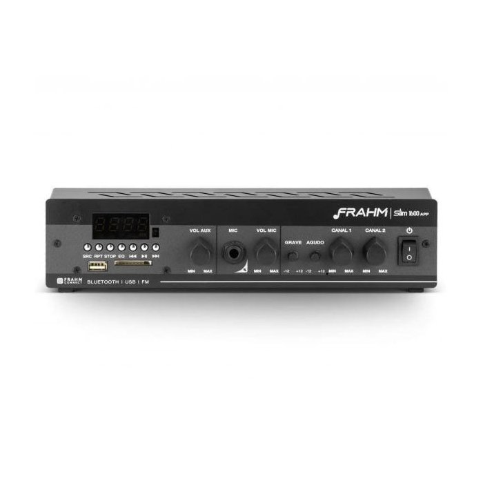 Amplificador Receiver Para Som Ambiente Slim 1600 APP Frahm O receiver Slim 1600 App da Frahm foi desenvolvido utilizando a mais alta tecnologia em engenharia de áudio. Seus componentes são de alto nível, garantindo reprodução sonora de alta definição. Seu formato slim facilita a instalação ou encaixe em racks, balcões e suportes. O receiver se integram perfeitamente aos mais diversos tipos de ambientes como: salas de aula, escritórios, lojas, quartos de hotéis/ motéis, residências... Características: - Recomendados Para Uso em Sonorização de Pequenos Ambientes - Para Projetos de Até 12 Caixas ou Arandelas (6 Por Canal) Com 8 Ohms Cada - Possibilita Comando Bluetooth de Funções via Aplicativo Frahm Especificações Técnicas: - Produto: Amplificador - Marca: Frahm - Modelo: Slim 1600 APP - Referência: 31843 - Potência RMS : 2x30W - Entrada : 2 Canais Independentes - Canal 1 : APP, Bluetooth, USB, SD Card e Rádio FM, Controle Remoto com Troca de Pastas / Auxiliar - iPhone, iPod, CD, DVD, TV - Canal 2 : Microfone - Saída : Line Out - Equalizador : 2 Vias (Graves e Agudos) - Alimentação : Bivolt Automático (Com Fonte Chaveada 90 - 240V) - Medidas Aproximadas do Amplificador (AxLxC): 6,5x28x10,5 cm Conteúdo da Embalagem: - 1 Receiver - 1 Controle Remoto - 2 Pilhas AAA - 1 Fonte de Alimentação Externa - 1 Manual do Usuário Medidas Aproximadas da Embalagem: - Altura: 8 cm - Largura: 32 cm - Comprimento: 21 cm - Peso: 1,500 Kg