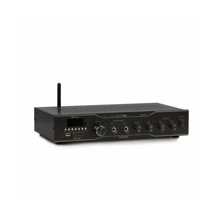 O amplificador Slim 2000 APP optical possui 120 Watts RMS de potência e é ideal para pequenos/médios ambientes. Possibilita comando de funções via aplicativo Frahm, além de conexão OPTICAL (recomendado para uso em TVS ou receptores digitais), possui também USB, SD Card, auxiliar (RCA), entradas para 2 Microfones com função, Volume Inteligente, (Baixa a trilha sonora automaticamente quando usado), Rádio FM e Bluetooth.