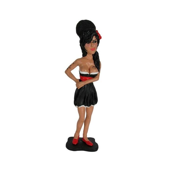 Amy Winehouse - Estatueta em Resina Amy Winehouse foi uma cantora e compositora inglesa conhecida por sua poderosa voz e performances marcantes. Amy é considerada a responsável por pela revolução na música soul da primeira década deste século. Confeccionada em resina de forma artesanal, essa estatueta é o presente ideal para colecionadores de miniaturas ou fãs da cantora. Material: Resina Altura: 27cm (boneco + base) Pintado à mão: Sim * As medidas são aproximadas e podem apresentar variação, pois trata-se de um produto confeccionado de forma artesanal. O objeto também pode apresentar variação comparado às imagens, pois é pintado à mão.