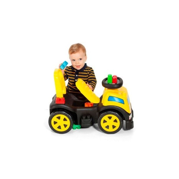 Existem muitas maneiras de construir e jogar! O andador para bebê vem com 10 blocos coloridos que as crianças podem conectar ao caminhão. Empilhe e brinque de montar.