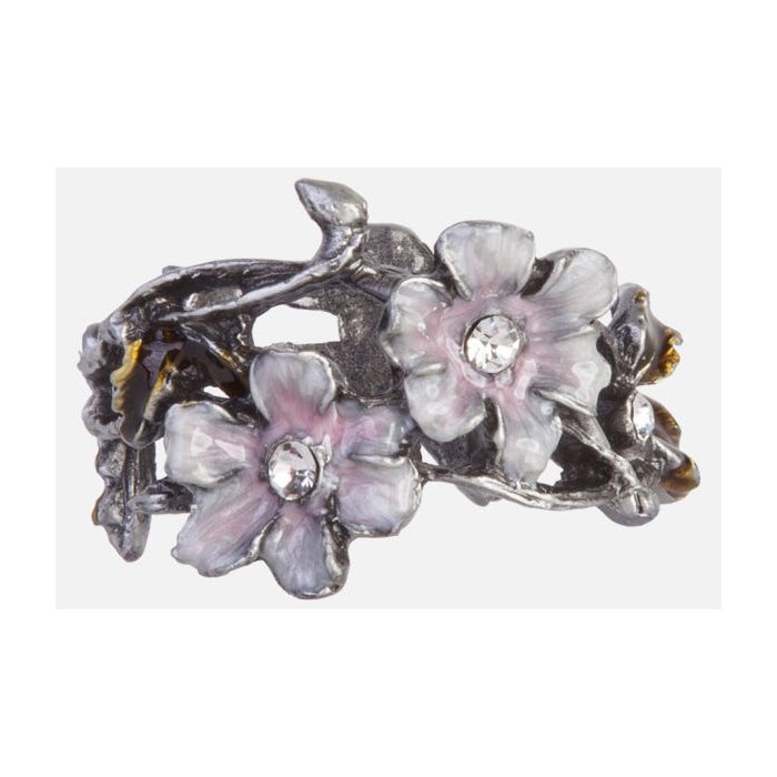 Anel de guardanapo "flores" em metal prateado, pintado à mão na cor lilás com aplicação de pedrarias.